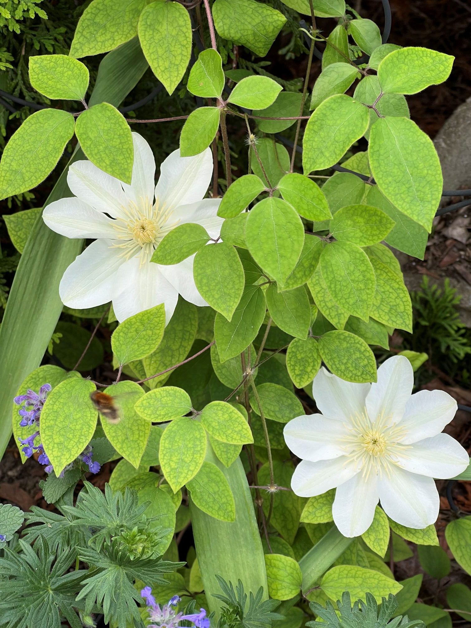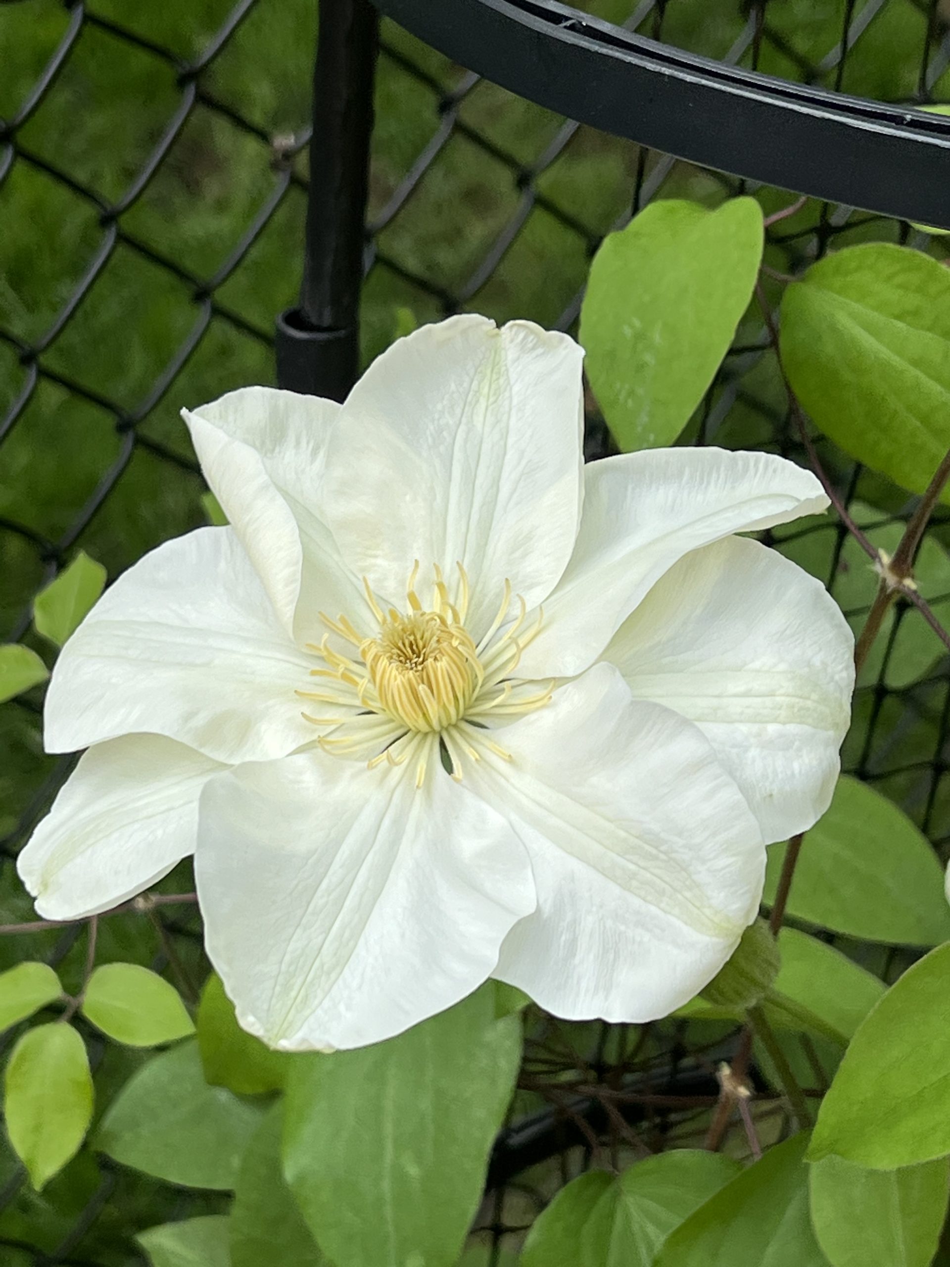 This clematis is known for its elegant creamy white colored blooms. The 6-8″ (15-20cm) are displayed May, June and August. One of the earliest to bloom amongst the large flowering hybrids. Mature height 6-9′ (2-3m). Pruning group B1.